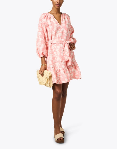Shoshanna's Adelia dress encapsulates all things feminine and chic. In a subtle pink color, this piece is made to pop with its contrasting floral jacquard print. It features a self-tie belt at the waist and a shirred skirt for a fit and flare silhouette. Accessorize this look with nude heels and gold jewelry for your next lunch with friends.