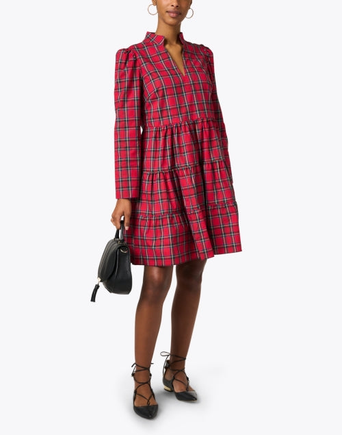 Red Plaid Puff Sleeve Smocked Midi Dress with a Tiered Skirt
