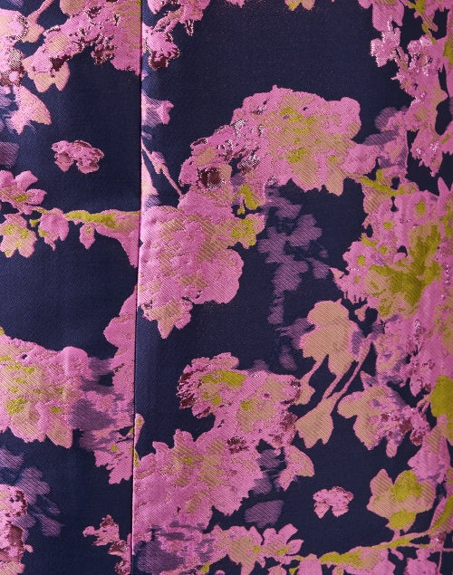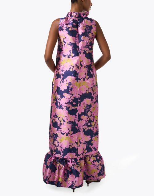The Camille dress by Abbey Glass is a striking maxi silhouette crafted in luminous pink and navy brocade. Designed with a ruffled neckline and a flounced hem, it offers effortless glamour with a modern, feminine touch. Perfect for warm-weather soirées or destination events, this dress makes a statement with timeless elegance.